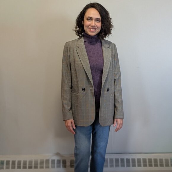 Elevate your style with this chic gray plaid blazer, adding a touch of sophistication to any outfit. Washed but never worn, it’s perfect for both work occasions and fall outings. Complete the look with the purple turtleneck and jeans shown in the photo for a polished, modern ensemble.