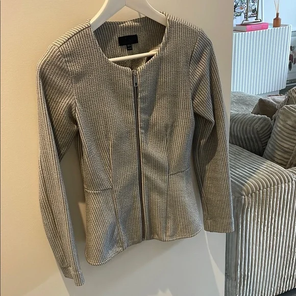 Elevate your style with this chic gray textured jacket. Perfect for any occasion, this jacket offers both comfort and elegance.