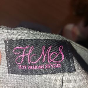 Hot Miami Styles. Gray, Laced front, Bodycon dress. This dress is very structured. Zipper goes 3/4 of the way down the back. Cotton, Polyester, Spandex blend. Size Small. Brand New with Tags