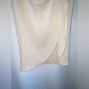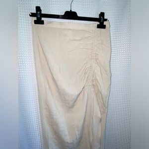Woven skirt, mid-calf length. High-waisted model with clip closure and hidden zip on one side. Draped effect in front and rising slit at the base. Not lined.