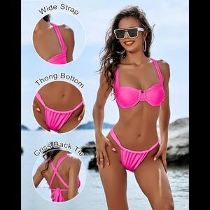 Brand new without tags women’s size S hot pink bikini set. Top has wide straps that criss crossed at back. Removable padded cups. Has that thong bottoms. Both pieces are double lined.