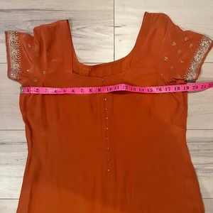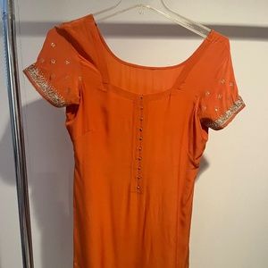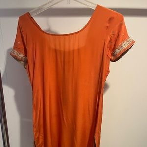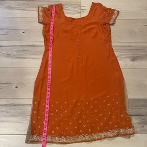 Women’s Indian 3 Piece Orange with Gold Silk Sequin Top & Pants w Matching Wrap-
