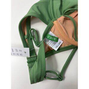 new J.Crew bikini top, style BX612, in size 34A. The color is RWI, a shade of green. The top features underwire cups and adjustable straps. The interior lining is a peach color. The item is new with tags and appears to be free of any visible imperfections. The body is 82% Recycled Nylon and 18% Elastane. The lining is 84% Recycled Nylon and 16% Elastane.