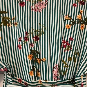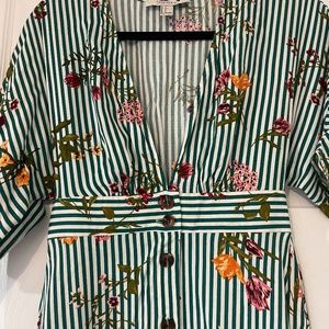 Flowy kimono-style floral dress. Deep "v" cut. Removal fabric belt. Fictional buttons down the front. Midi length.