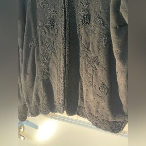 Women’s Lambswool Black Beaded Sweater from Isabella. The sweater is in solid black with sequin and beads in a floral pattern.