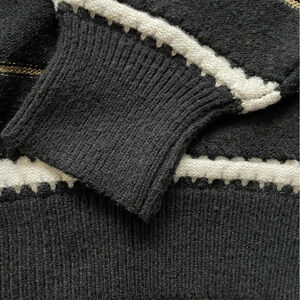 Black knit sweater with white and metallic gold stripes in a women’s large.