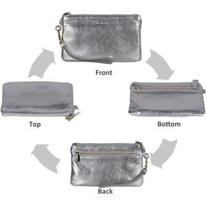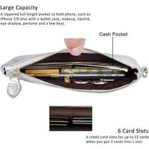 Construction: Main pocket: 6 credit card slots, cash pocket, an interior zipper pocket and top zipper closure. Roomy enough to fit cards, cash, coins, smartphone, passport and other essentials. Outside: A back zippered pocket provides quick access for your phone or other small stuff. Comes with a 6.5" detachable wrist strap to free your hands.