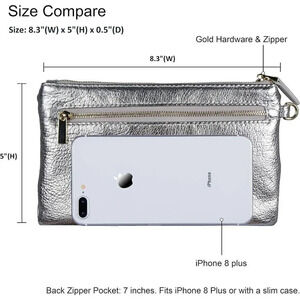 PRODUCT EXTERIOR MEASURE: 8.3"(W) x 5.0"(H) x 0.5"(D) inches. With quality leather and beautiful craftsmanship, it is a perfect clutch for casual night out or attending a party, whether you dress up or down. Soft feel, organized structure, sleek looking make it a perfect gift for your friends or family members.