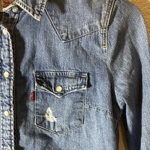 Women's 'Classic Fit' denim button-up shirt in stylish denim; a touch of 'chic' with intentional rips paired with pearl buttons. Perfect for casual wear with a touch of rugged charm, exactly what one would expect from Levi's. NWOT. Sz. Xsml.