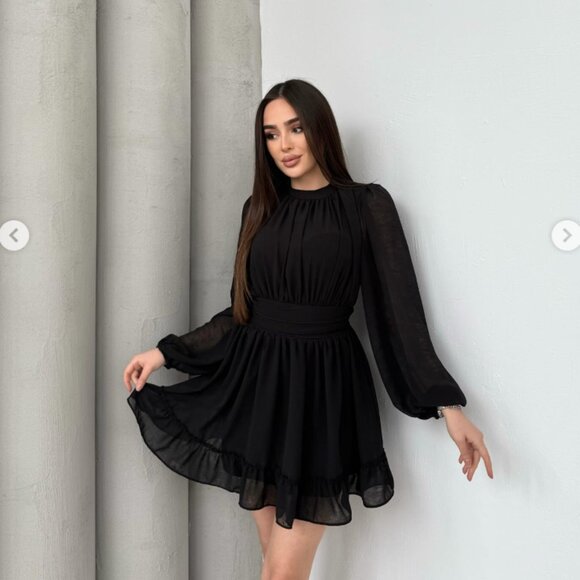 Women's Long Sleeve Ruffled Hem Half High Neck Pleated Mini Dress - S, M, L, XL