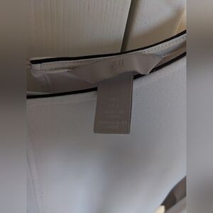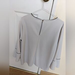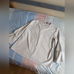This elegant white top is perfect for any occasion. Its simple yet sophisticated design makes it a versatile addition to your wardrobe. Has a keyhole design on the back. It has been worn and washed and the colour is slightly grey as a result, so not purely white. Wide sleeve design. Imperfections shown in pictures.