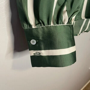 Stylish long sleeved collared shirt with button cuffs in green/white strips size small by Harve & Blair