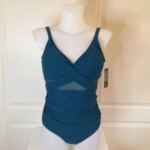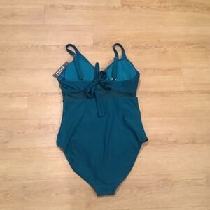 Brand new Blooming Jelly women’s size L teal tummy control one piece bathing suit. This one piece combines a flattering v neck, removable pad, criss cross front, and sheer mesh cutout back for a sexy yet feminine look. The ruched front conceals the tummy, providing a slimming effect and enhancing your curves for a confident silhouette. Full coverage modest bottom. Adjustable straps.