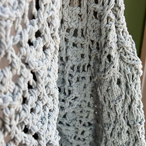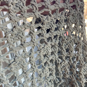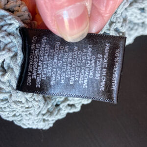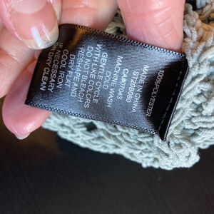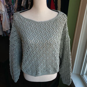 This is a pre-owned Moon & Madison sweater, size XL. It features a light green, open-knit design made of 100% polyester. The sweater has a wide, boat-neck collar and long sleeves with ribbed cuffs. The hem is also ribbed. The open-knit construction creates a semi-sheer effect. There are no visible stains, tears, or other significant imperfections. The sweater appears to be in good condition.