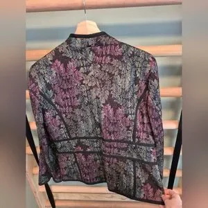 This blazer features an interesting embroidered leaf pattern in muted rainbow tones with black contrast stitching throughout and statement buttons