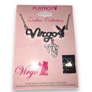 This limited edition necklace from Playboy features a script lettering pendant with the Playboy Bunny and the Virgo sign. The necklace is made of silver metal and has a lobster closure. It is 18 inches long and has an adjustable chain type of round link.