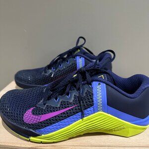 Women's Nike Metcon 6 Crossfit/Gym shoes, Sz. 7.5 in excellent used condition. Colourway is "Blackened Blue/Red Plum/Cyber Yellow"