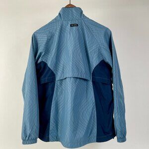 This is the perfect running jacket -- lightweight, breathable and comfortable. The powder blue background is accentuated with super flattering navy side panels and a subtle light grey reflective pattern. Great details like venting at the back and under the arms, adjustable drawstring waist, elasticized cuffs, two way zipper and two zippered slash pockets, and a very light soft fleece at the neck to prevent chafing. So great looking and well made, this will become your go-to spring and fall jacket, and not just for those morning or evening runs!