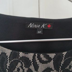 This classic sleeveless knee length shift dress by Nina K is generously sized to fit loosely on a size 6 body even though it is marked small. It has a flattering fit and slimming cut and the polyester mix fabric is thick enough to conceal imperfections of the figure. The lovely lace panel on the front sets it apart from the ordinary little black dress.