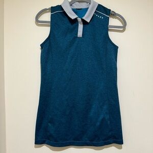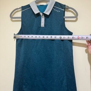 Women’s Oakley Blue Golf Sport Activewear Lightweight Tennis Tank Top No Size tag. Blue colour with hidden button detail. Material tag and clothing tag are both cut out. Look at measurements for sizing accuracy. In great condition no issues or flaws. Measurements included in photos.