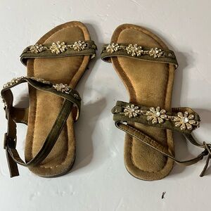 Women’s Olive Green Rhinestone Flower Sandals Size 7 Flat Ankle Strap Boho Chic