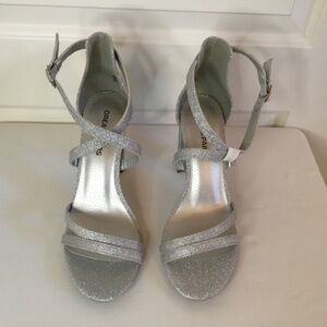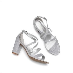 Brand new without box Dream Pairs women’s size 9.5 Silver/Glitter open toe cross strap high Chucky block dress pump heels. Latex padded insole for added comfort. Crossed strap design with adjustable buckle closure. Heel height approximately 3”