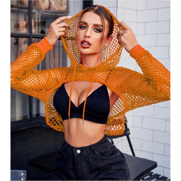🆕Women’s Orange Mesh Hoodie Crop Top Long Sleeve Fishnet Shirt Casual Hoodie