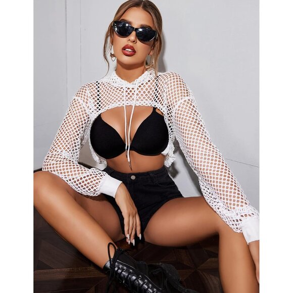 🌸【Unique Design】Womens fishnet shirt features a loose fishnet and a cropped navel that's easy for both smaller and larger women to pull off. Puff long sleeves and hooded design can be worn all year round.