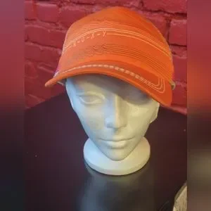 Women's Orange Roxy Hat. Snap back adjustable hat. Orange with image of water, mountains and sun with lines.