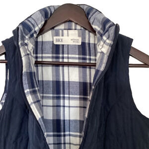 BKE soft blue zipper up vest with plaid lining and two side pockets.