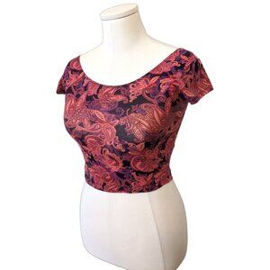 Super cute pink paisley top from Garage! This crop top features a scoop neck, short sleeves, and a somewhat stretchy material. It has some general wear but no rips or stains. Overall it is in good condition!