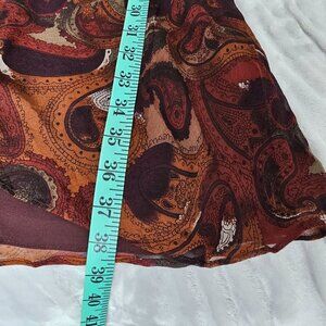 No visible tags were found. Please see measurements. Approx. M/L size. Material feels light, chiffon