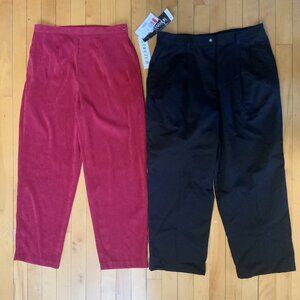 This lot includes 2 pair of pants. Sag Harbor stretch pants are red and size 14. Haggar Pants are black and size 16. Both are new.