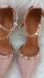 a pair of women's high-heeled shoes, specifically pumps, in a light, glossy, possibly patent leather material, likely a nude or blush pink color