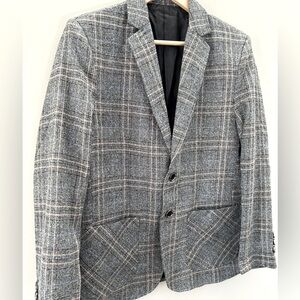 Women’s stylish plaid black and white blazer with hits of light blue and pinky/orange