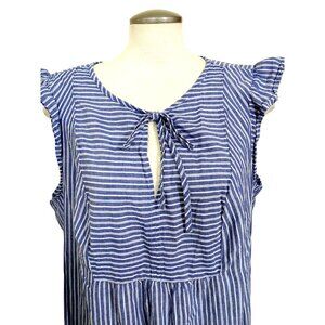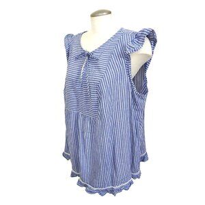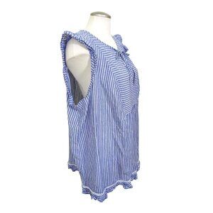 This is a women's plus size sleeveless tank top in blue and white stripes with a keyhole front and ruffle accents. The top has a coastal grandma, nautical-themed design, perfect for a casual summer or spring outfit. It is made of a comfortable and breathable 100% cotton material and features a classic fit. The brand is Joe Fresh, and the size type is plus.