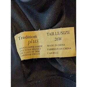 This is a one piece swimdress for women in a size 26W, featuring a padded swim top with a colorful tropical floral pattern on a black background. The swimdress is made of nylon and spandex, has a Hawaiian and tropical theme, and includes padded cups for extra support. The brand is Tradition Plus, and it is designed as a plus size swimwear option.