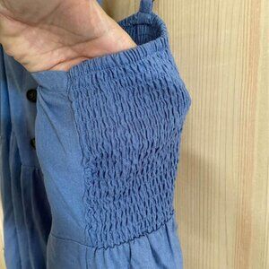 Woman’s “IN STYLE” summer dress. Goes past knee at 47”. Denim color. Linen blend. Not lined. Some wear under one arm as seen in last picture.