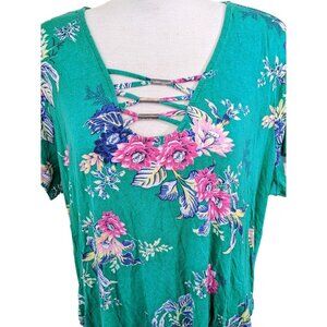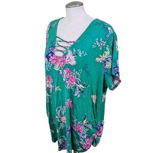 Womens Plus Size 3X Top Kelly Green Floral Criss Cross Neckline Ruched Side