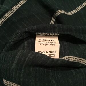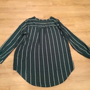 Brand new without tags women’s size 2XL green stripped oversized long sleeve blouse. Features V neck with 3 buttons, long cuff sleeves and 1 front pocket. Lightweight and slightly sheer. Oversize fit. Has a high low hem. 95% Polyester and 5% Spandex