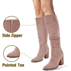 Women's Pointed Toe Knee High Faux Suede Slouch Taupe High Boots Chunky Heels
