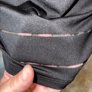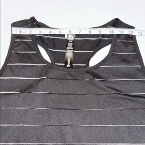 Stylish black racerback tank top by RBX. Features unique horizontal mesh design. Perfect for workouts or casual wear. Athletic, spring, summer, cool attire. Has stretch.
