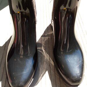 Step out in style on rainy days with these fashionable women’s rain boots. Featuring a sleek black glossy finish with brown detailing and designer-inspired accents, these boots offer both style and practicality. Gently used and in good condition with minimal signs of wear.