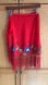 Red wrap skirt featuring hand-painted floral accents and a dramatic fringe hem. Made from a lightweight, semi-sheer fabric.