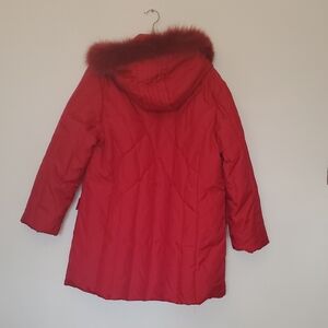 Stay warm and stylish with this vibrant red jacket featuring a luxurious faux fur trim. Perfect for chilly days. Down filled, detachable hood.