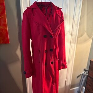 Red long trench coat, unlined design. Double-breasted with black button details, lapel collar, and front pockets. Lightweight and stylish, perfect for layering in spring or fall. Size XL. Pre-owned, gently used condition.