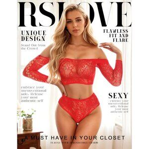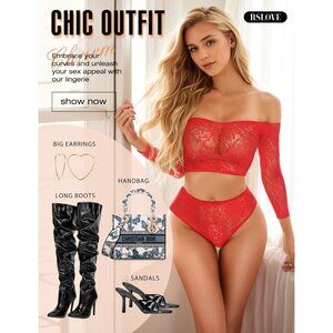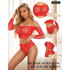 🆕Women's Red Mesh Fishnet Lingerie Bodysuit Long Sleeve Lace See-Through
