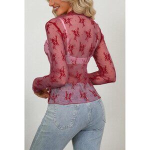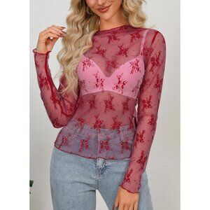 🆕Women’s Red Mesh Sheer Top Long Sleeve Mock Neck Sexy See Through Lace Blouse