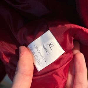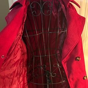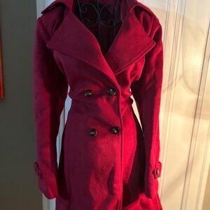 Super soft red wool-blend trench coat. Double-breasted with large lapel collar, button details, waist belt, and full lining. Extremely comfortable and warm. Size XL but okay for M and L. Worn only once – excellent like new condition.