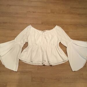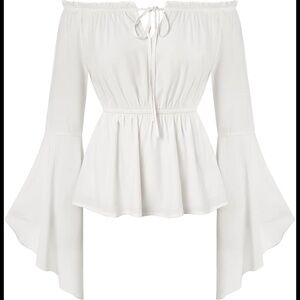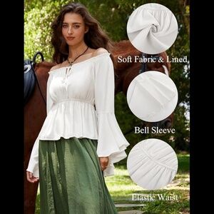 Brand new without tags SCARLET DARKNESS women’s size 2XL white renaissance shirt peasant blouse off the shoulder tops. Renaissance-inspired top featuring an off-the-shoulder neckline, cascading bell sleeves and stretchy elastic waistband that creates a flattering silhouette. Crafted from a soft blend of 62% Viscose and 38% Polyester with a full lining for opacity.